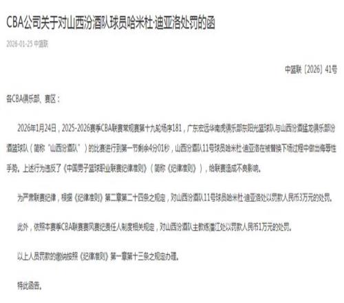 CBA公司关于对山西汾酒队球员迪亚洛处罚的函