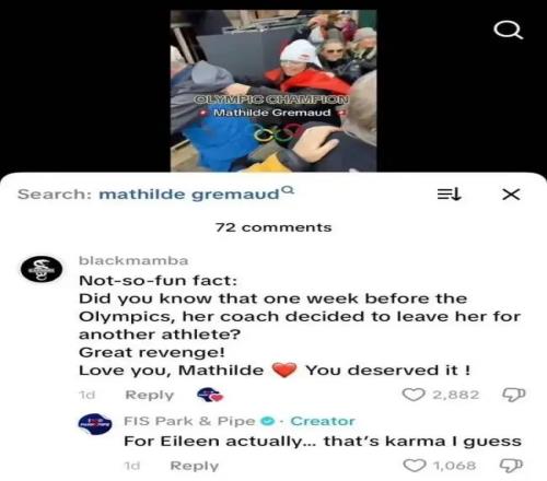 赛后,有网友在国际雪联(FIS)官方社交媒体账号评论区留言称:"冷知识:你知道吗?在奥运会前一周,她的教练决定离开她,去执教另一名运动员。这复仇太解气了!爱你,马蒂尔德,这是你应得的!"
